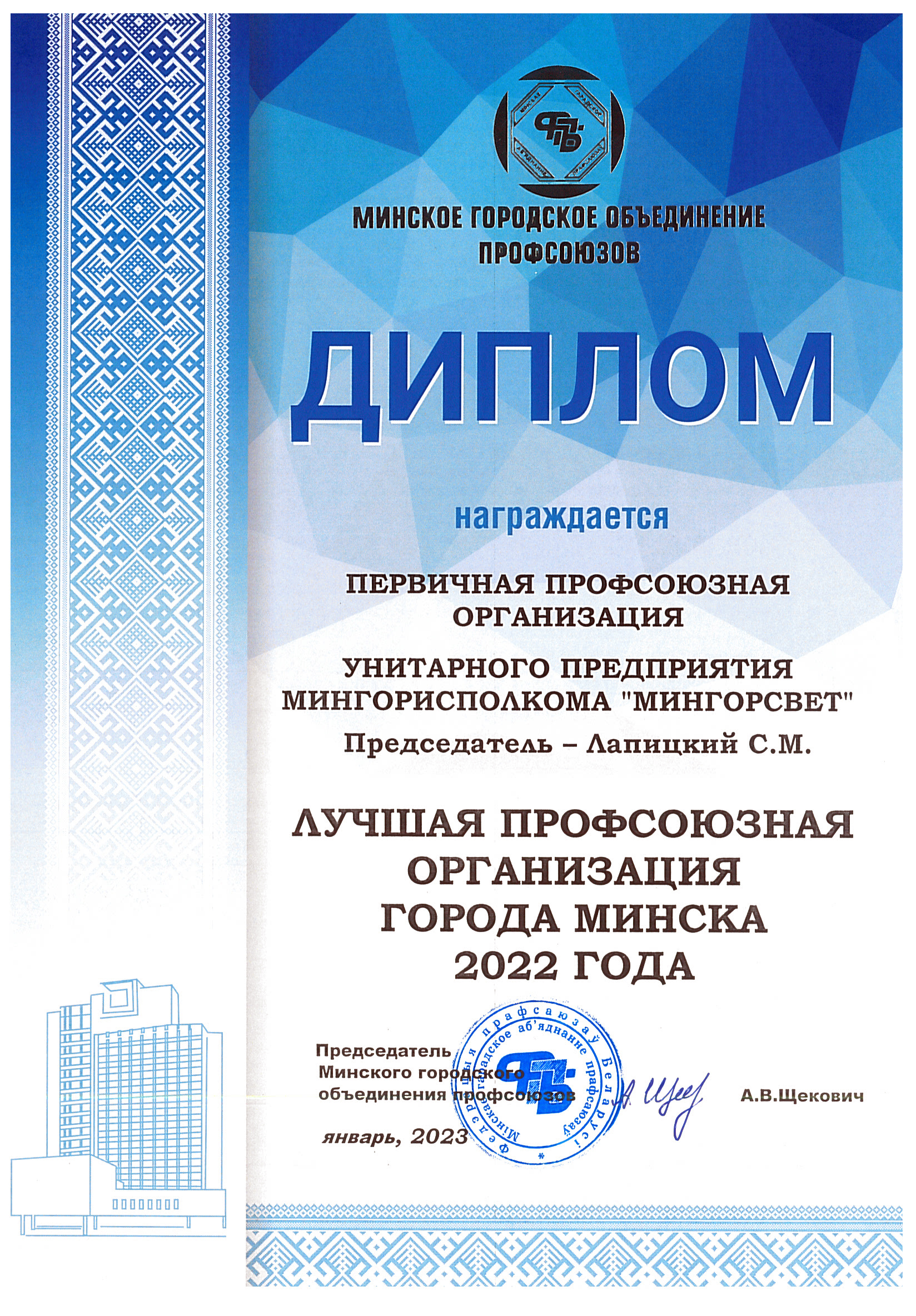 По итогам работы 2022 года Первичная профсоюзная организация УП «Мингорсвет» стала лучшей профсоюзной организацией города Минска.